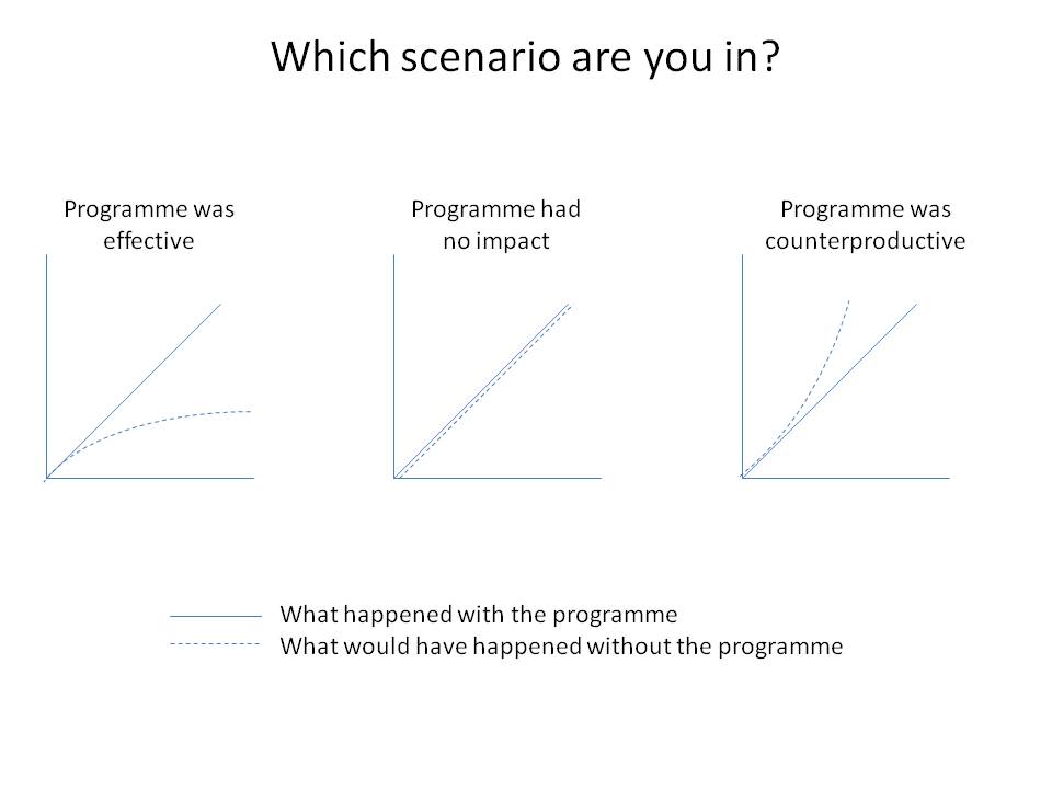 To see why something happened, we need a control, that is, a situation in which everything is the same apart from the charity’s work. This will show which of the scenarios above applies and therefore whether the programme is actually doing anything useful.