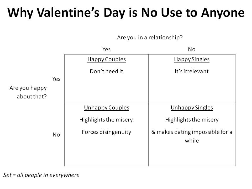 All people in the universe are either in a relationship or not, and all people in the universe are either happy about that or not. Whichever category you’re in, Valentine’s Day is useless – with one microscopic and surprising exception.