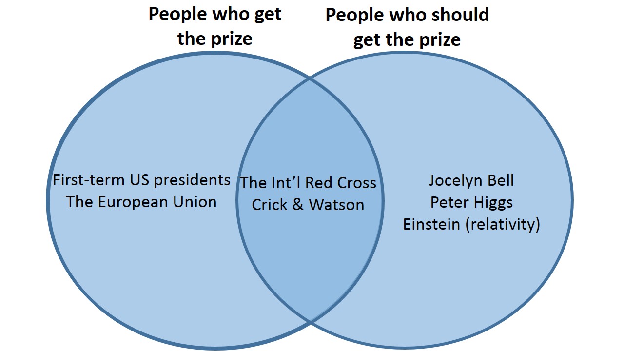 On the other side of the Venn diagram, there are many people and organisations who one thinks should get it but don’t. The physicist Jocelyn Bell is perhaps the best example: her discovery of pulsars landed Nobel Prizes for her two (male) supervisors but not for her. (She’s still alive, so it’s not too late for the Nobel Committee to correct.) Einstein never got one for relativity – arguably the greatest achievement of the human mind – despite empirical evidence (a prerequisite for the Prize) during his lifetime. Another example might be physicist Peter Higgs for his accurate prediction of the particle which bears his name. It’s possible that that Higgs is ineligible because his predication resulted from a collaboration between many people and the Prize can be shared by no more than three people, though it could be awarded to CERN, for finding the particle, because organisations can receive it.