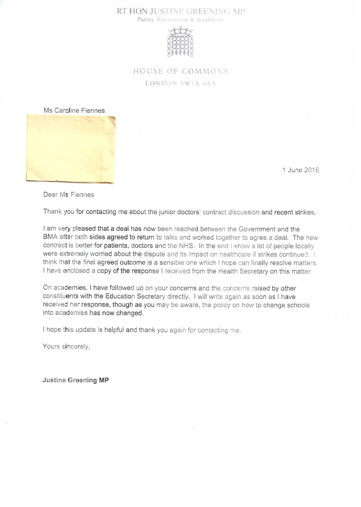 In April, I wrote to my MP, Cabinet Minister Justine Greening, about the fact that there’s no evidence that the new contract being imposed on the NHS will improve anything and some evidence that it’s discriminatory. My letter’s here.