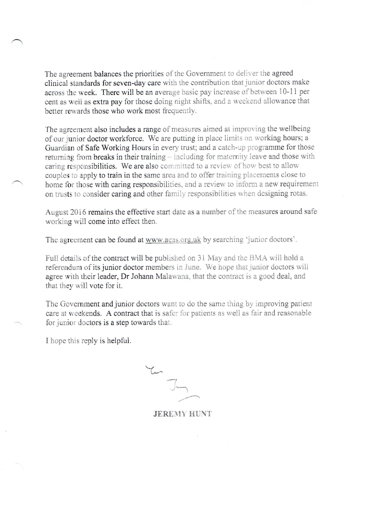 Thanks for forwarding Jeremy Hunt’s response to my letter to you (published here) concerning what he’s doing with the NHS. And by the way, congrats on your appointment to education.